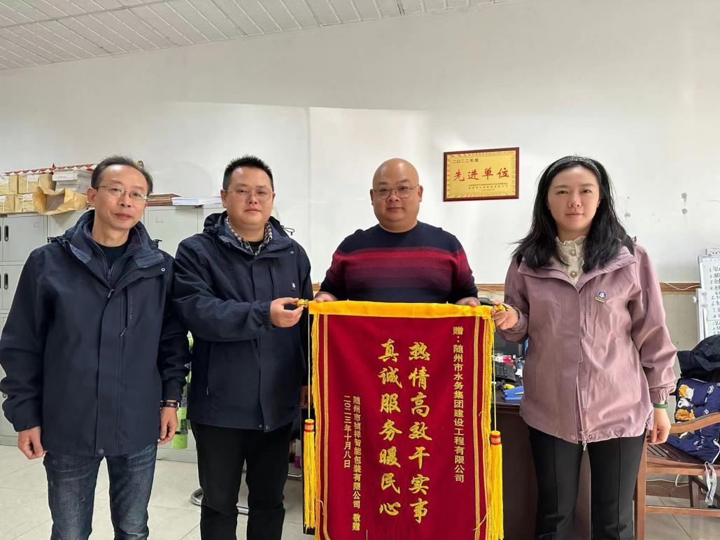 近日,隨州市禎祥智能包裝有限公司負(fù)責(zé)人親自將一面印有“熱情高效干實(shí)事,真誠服務(wù)暖民心”的錦旗送到水務(wù)集團(tuán),并對我們夸贊到“現(xiàn)在你們的速度太快了,我才打電話要申請通水,不到兩個(gè)小時(shí),你們就來人把水給我接通了”。
