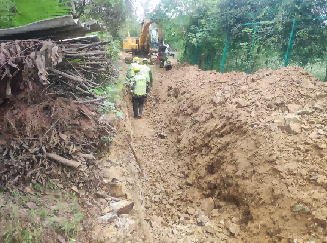 機(jī)電學(xué)校DN250球墨管供水工程線路處于山地丘陵地帶,沿線涉及鄉(xiāng)村道路、開墾菜園、陡峭山體等多重地質(zhì)和復(fù)雜環(huán)境考驗(yàn)。在沿機(jī)電學(xué)校圍墻邊緣鋪設(shè)段,鄉(xiāng)村道路與圍墻之間不足3米的狹窄空間,成為施工線路上的“攔路虎”,該道路是周邊居民日常出行的主要通道,一旦長時(shí)間阻斷,將嚴(yán)重影響群眾生活。項(xiàng)目部與學(xué)校和村委共同研討下,最終確定利用2天時(shí)間,集中突擊,調(diào)用多臺(tái)設(shè)備,全力沖刺,快速施工完成后復(fù)路于民,順利啃下硬骨頭。