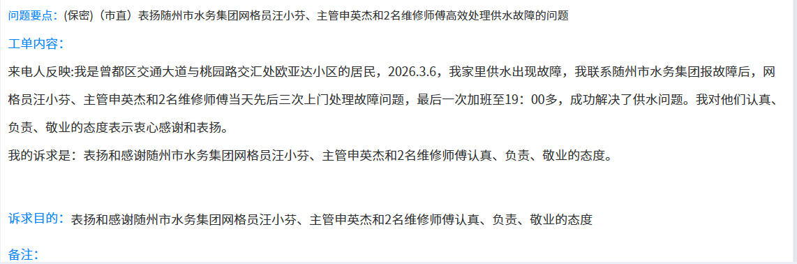 近日,隨州水務(wù)集團收到市民通過12345政務(wù)服務(wù)便民熱線打來的專屬表揚電話,市民王女士對工作人員高效響應(yīng)、貼心服務(wù)的表現(xiàn)致以誠摯感謝。這一通暖心來電,既是對供水服務(wù)的高度認(rèn)可,更是水務(wù)集團堅守民生初心、彰顯服務(wù)溫度的生動體現(xiàn)。
