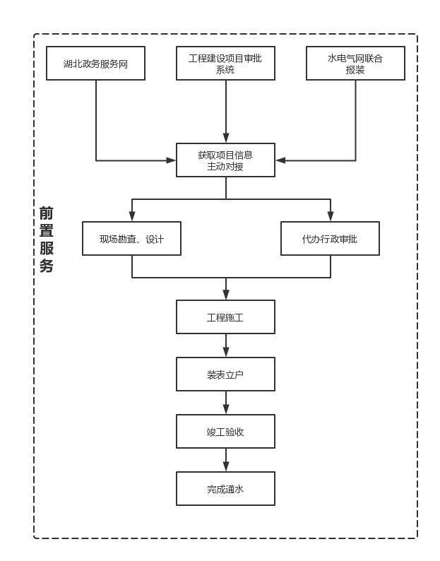 (一)通過(guò)政企數(shù)據(jù)共享及通過(guò)湖北省工程建設(shè)審批系統(tǒng)、湖北政務(wù)服務(wù)網(wǎng)等渠道,獲取用戶(hù)信息,主動(dòng)對(duì)接,主動(dòng)掌握用戶(hù)用水需求,根據(jù)接入地點(diǎn)的不同和用戶(hù)需求,確定是否需要在地塊紅線(xiàn)外增設(shè)接入管線(xiàn),并將后續(xù)相關(guān)事項(xiàng)告知用戶(hù)。