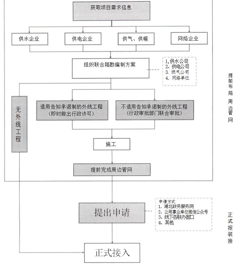 ( 一) 一 口登記早服務。 新建投資項目在土地出讓階段, 隨同填寫《用戶獲得水、電、氣、網、暖需求信息采集單》, 對新建項目施工和生產所需的用水、用電、用氣、用網、用暖 需求進行意向登記。將項目報裝需求通過湖北政務服務網、工 改平臺傳遞給各公用事業(yè)單位,公用事業(yè)單位聯合上門對接, 根據用戶需求提前布局項目周邊區(qū)域管網,為用戶后續(xù)獲得水、電、氣、網、暖接入作好準備。